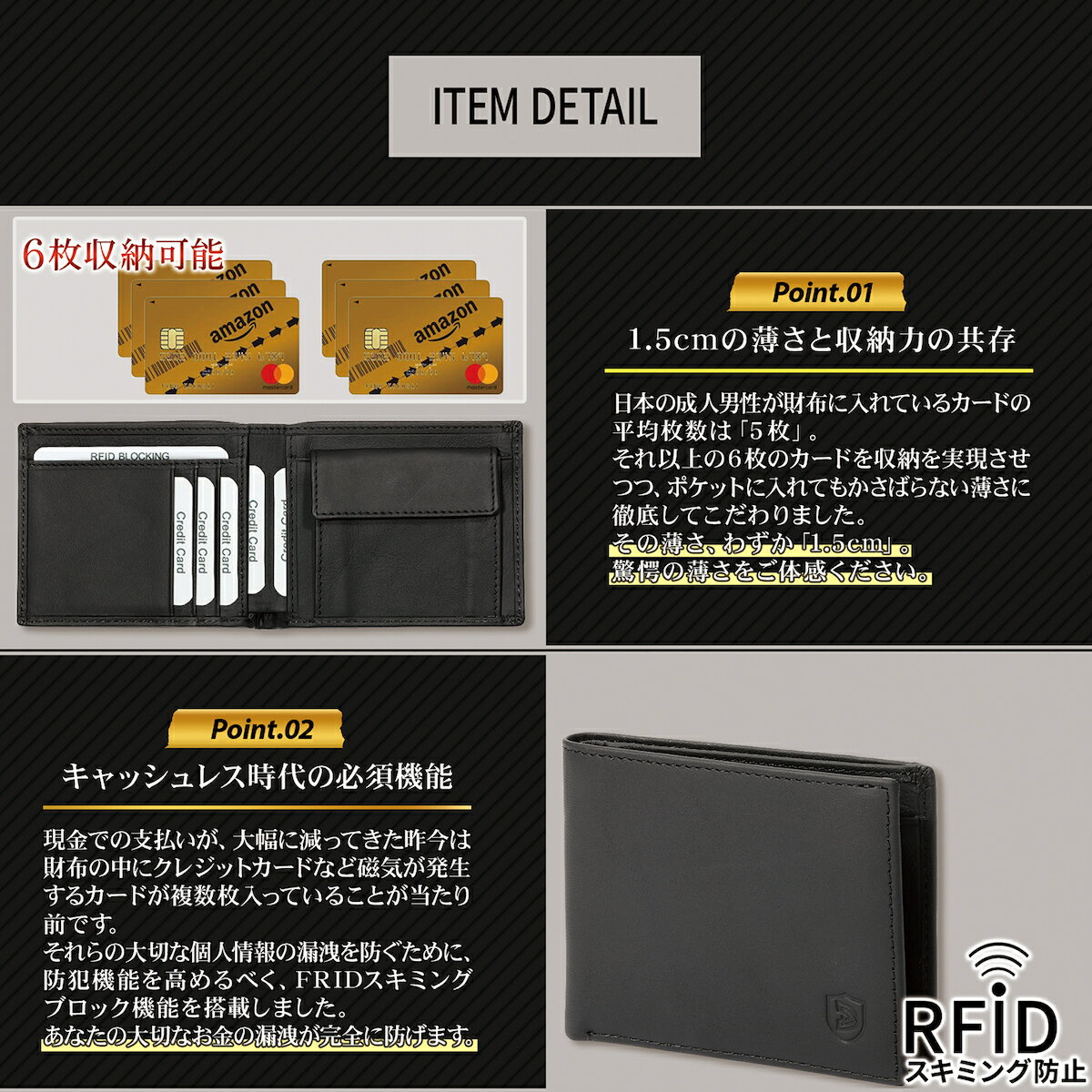 掲載実績 雑誌:令和のベストヒット大賞掲載 まとめサイト:内定祝いに嬉しいギフト受賞 Instagram:総いいね数1000突破 商品特徴 ■求めた先に辿り着いた機能美 ■わずか1.5cmの極薄設計(未収納時) ■6箇所のカードポケット+フリーポケット ■RFIDスキミング防止素材 ■耐久性の高い本革ハイブリッドレザー カラー ブラック 黒 素材 本革 ハイブリッドレザー サイズ 11 cm × 8.5 cm × 1.5 cm 重量 55 g 使用上の注意 雨などで濡れてしまった場合、乾いた布などで優しく拭き取り、日陰にて干してください。